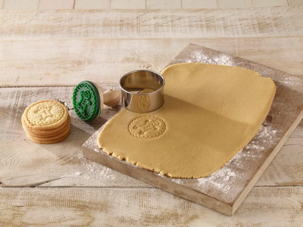 Dieser hochwertige Stempel ist aus Holz gefertigt und mit einem abnehmbaren Stempelkopf aus Silikon versehen, der in der Spülmaschine gereinigt werden kann. In Nullkommanichts entstehen mit dem Stempel formschöne, knusprige, geprägte Lebkuchenmann-Kekse zum Naschen und Verschenken. Zuerst den Teig dick ausrollen, dann mit einem Dessert- und Speisering ausstechen oder einen Taler per Hand formen und anschließend mit dem Stempel dem Keks eine einzigartige Prägung verleihen. Fertig!
