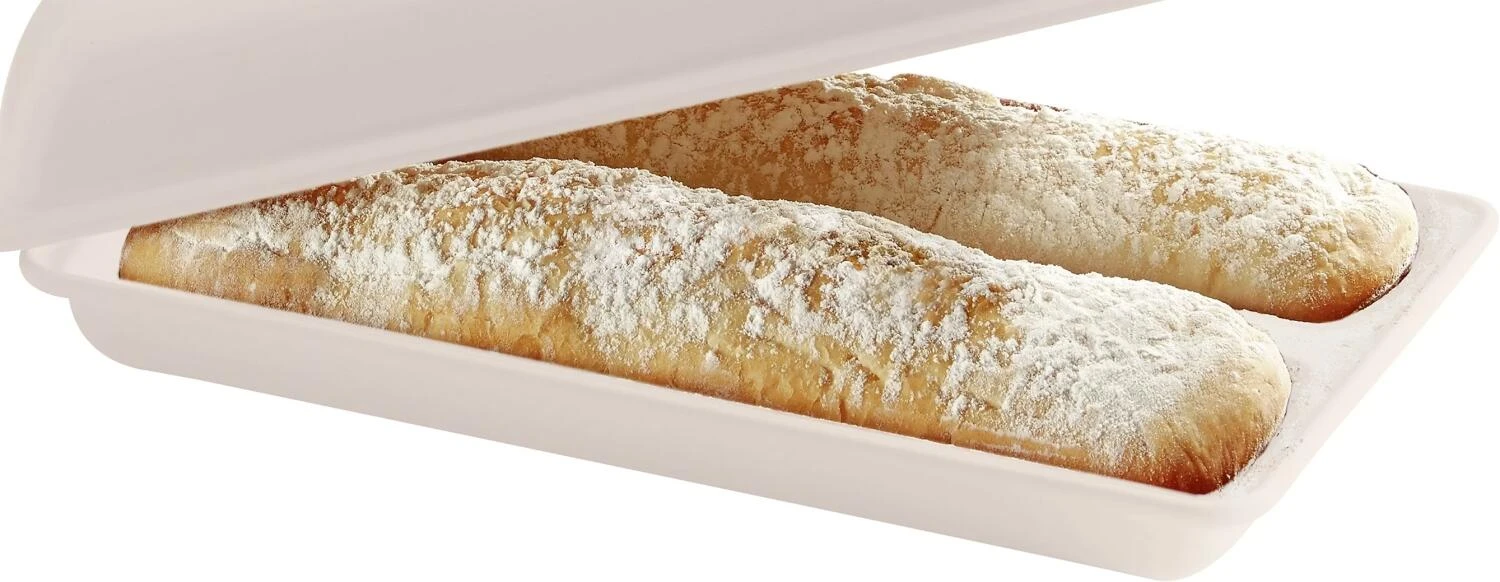 Das Set von Emile Henry bietet die Möglichkeit für 2 Ciabattas mit bis zu 250 g pro Stück. So klappen gut geformte und gleichmäßige Brote ganz leicht. Der gewölbte Deckel hilft außerdem die Feuchtigkeit zu kontrollieren und die ideale Konsistenz zu gewährleisten.