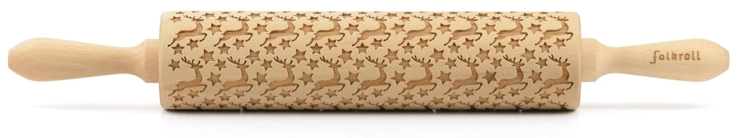 Folkroll Teigrolle Rentier Sterne. Mehr als das klassische Nudelholz, nämlich eine Teigrolle mit tollen Mustern und Motiven in 3D-Optik. In 2 Größen erhältlich.