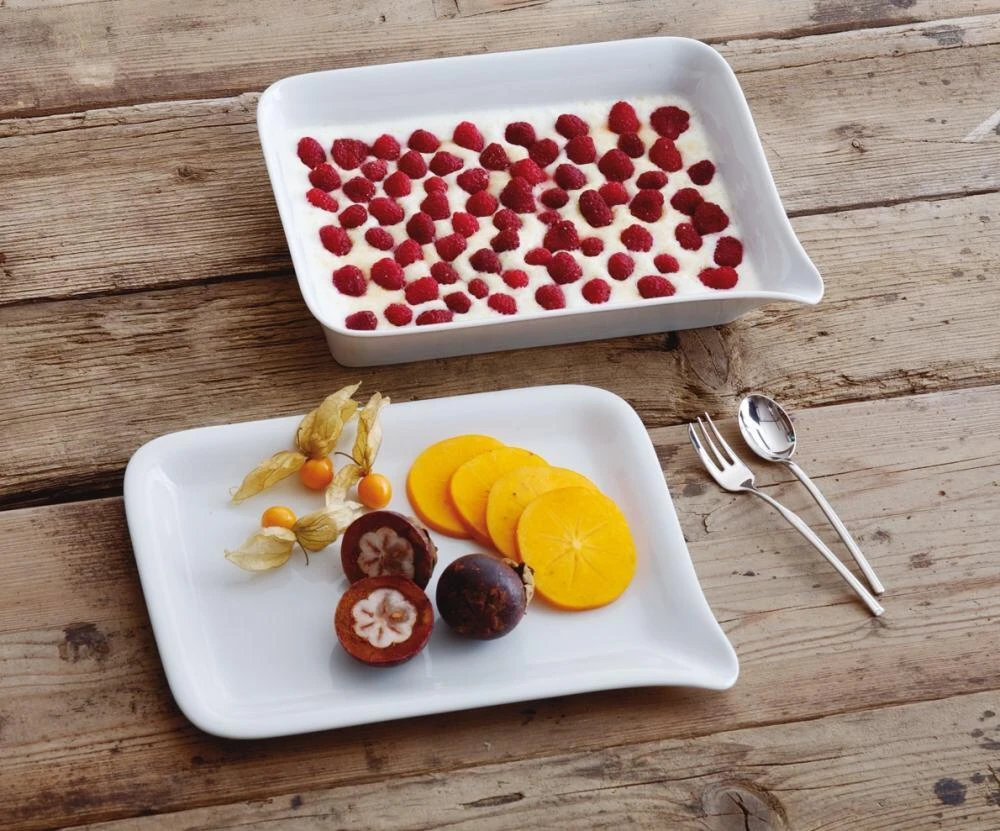 Zum Backen und Dünsten im Ofen gibt es die Kahla Backformen Five Senses in insgesamt drei Größen. Bei allen Gefäßen ist eine Ecke so geformt, dass sich überschüssige Flüssigkeit abgießen und Sauce ausgießen lässt.