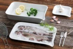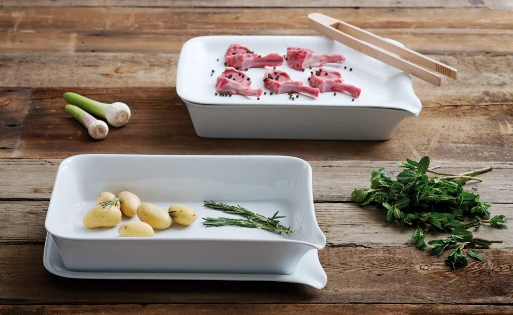 Zum Backen und Dünsten im Ofen gibt es die Kahla Backformen Five Senses. Bei allen Gefäßen ist eine Ecke so geformt, dass sich überschüssige Flüssigkeit abgießen und Sauce ausgießen lässt.