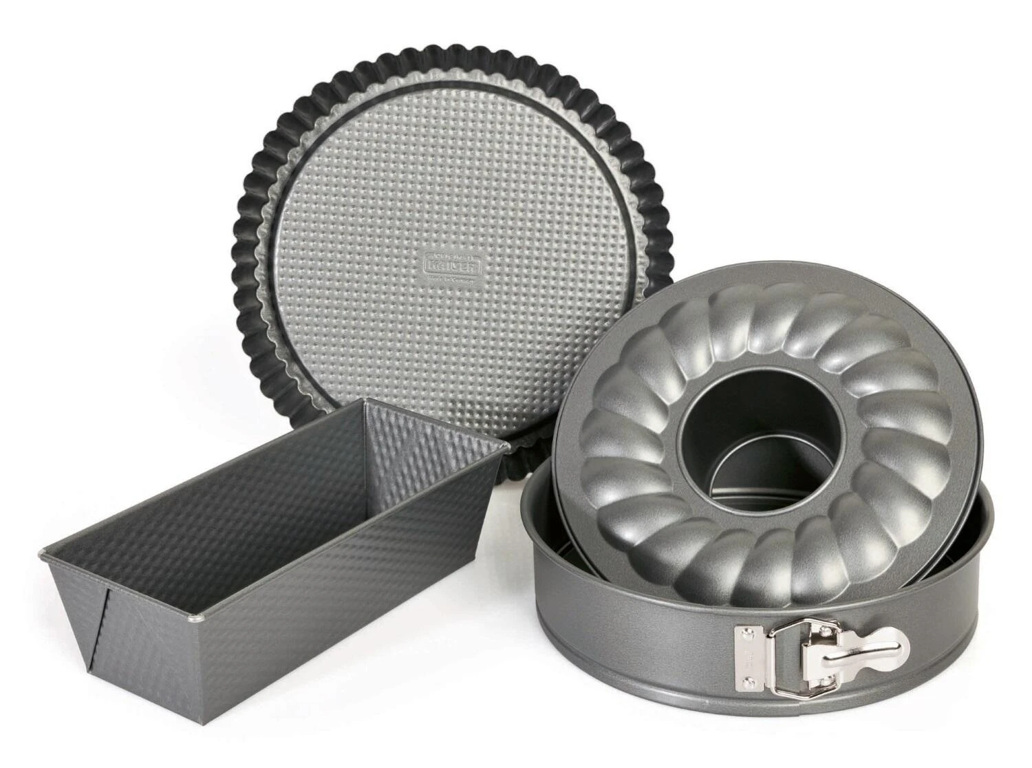 Das Kaiser Backformen sorgen für das perfekte Backvergnügen. Das Kaiser Backform Set beinhaltet eine Springform (ø 26 cm, Höhe 8 cm, Volumen ca. 2,9l) mit Flachboden für Kuchen- und Tortenböden, einen Rohrbodeneinsatz für Rührkuchen und Gugelhupf (Volumen ca. 2,4l), einen Tortenboden 28 cm für leckerste Quiches und Obstkuchen und eine Königskuchenform 25 cm für süßes und deftiges Backwerk, wie Kuchen oder Brote mit Ecken und Kanten.