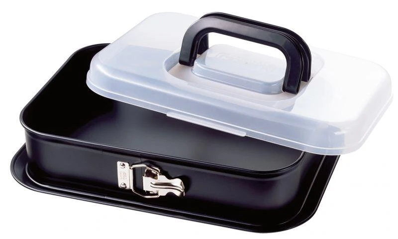 Springform rechteckig mit Transporthaube. Die unzerbrechliche Haube aus transparentem Kunststoff schützt die Kuchen, hält frisch und ermöglicht einen einfachen und sicheren Transport.