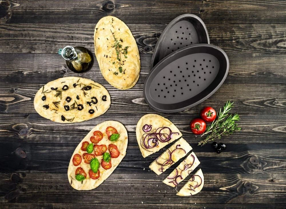 In der ovalen Flexiform Pizza 2er Set gelingen Ihnen Pizza und Foccacia im Handumdrehen. Durch die besondere Form wird ihr Teig gleichmäßig gebacken. Die Löcher im Boden sorgen dafür, dass die Unterseite der Pizza schön knusprig wird. Für eine perfekte Pizza benötigen Sie nur diese Form. Das hochwertige 100 % Platin-Silikon erspart Ihnen zusätzliches Einfetten und Backpapier.