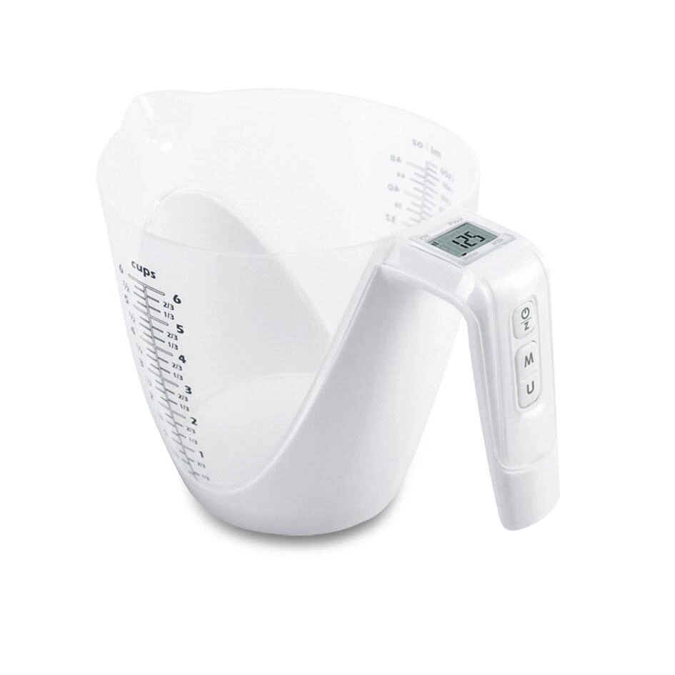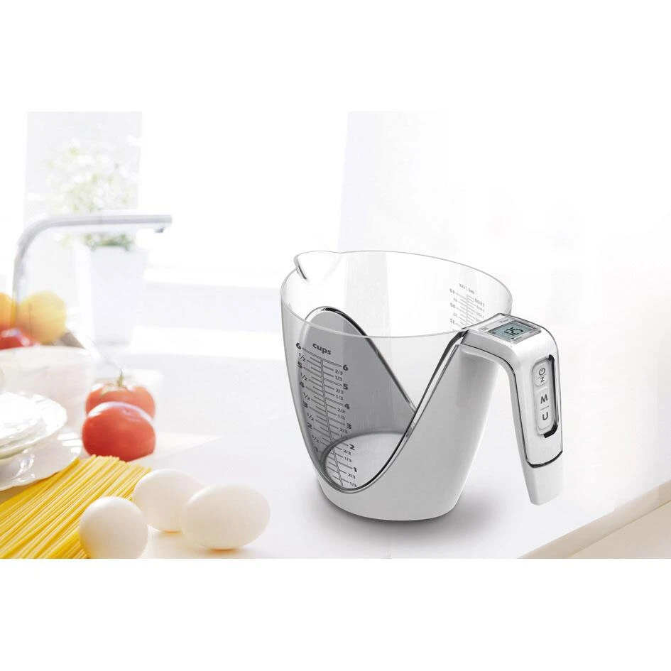 Die digitale Waage mit abnehmbarem Messbecher ist eine der praktischsten Erfindungen für die Küche. Neben dem exakten Abmessen von Zutaten können diese auch gleichzeitig abgewogen werden.