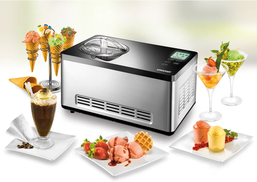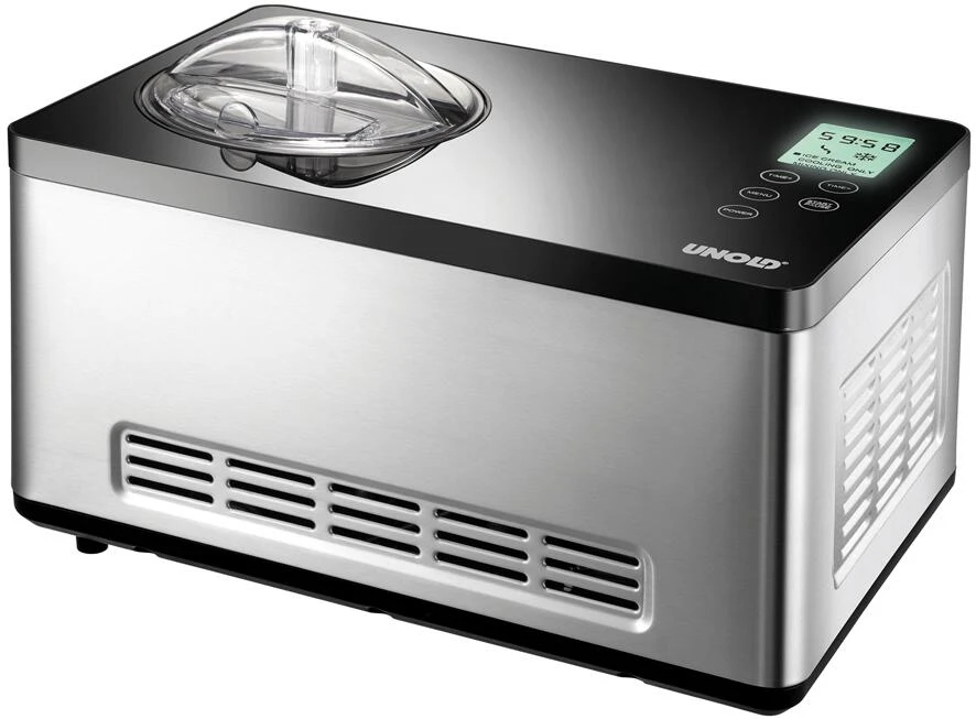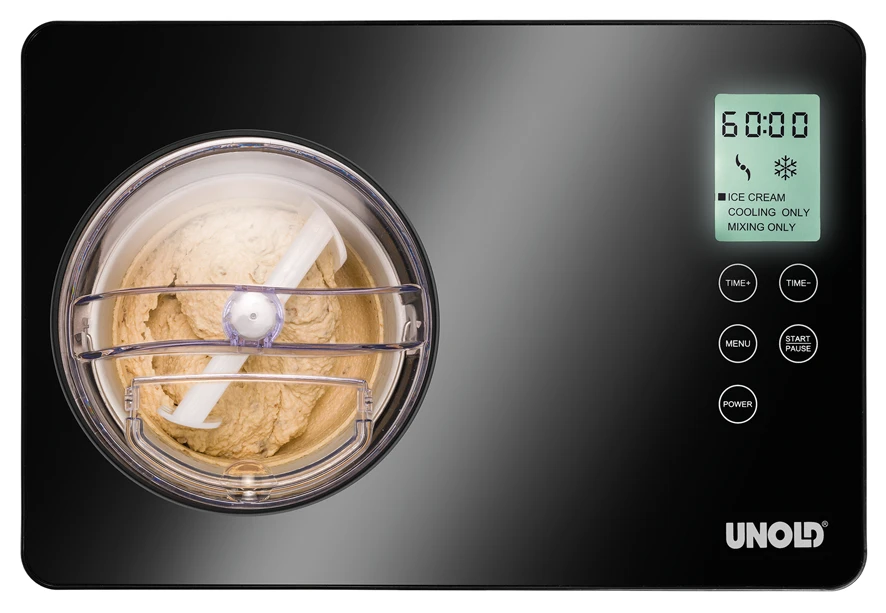 Unold Eismaschine Gusto. Für die schnelle Zubereitung von bis zu 2 Litern Eiscreme. Mit Rezepten und Sensor-Bedienfeld zum Mischen und Gefrieren.