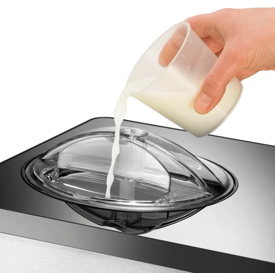 Über eine Deckelöffnung kann der 2 Liter fassende Edelstahlbecher sicher entnommen und Zutaten wie Früchte, Nüsse oder Schockolade zugegeben werden. Der digitaler Timer ist dabei minutengenau einstellbar.