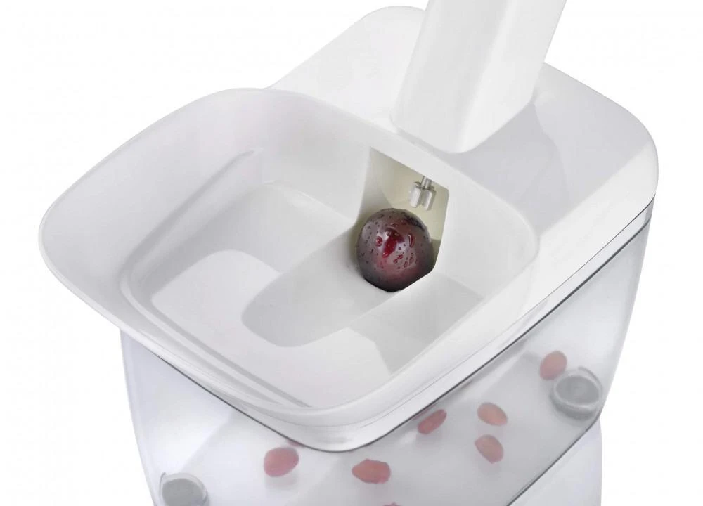 Westmark besticht durch eine robuste Entsteiner-Einheit und ein geschliffenes Kreuzmesser aus Edelstahl und ist damit sowohl für frische und koservierte als auch tiefgefrorene Früchte geeignet. Durch die optimal geneigte Schütte lässt sich die Entkerneinheit schnell wiederbefüllen. Der Entsteiner ist schnell und einfach zusammengesetzt und wieder auseinander genommen und lässt sich einfach unter fließendem Wasser reinigen. Durch die vier Gummifüße am Boden steht der Westmark Kernfix sicher auf jeder Küchenoberfläche. Zum Lieferumfang gehört außerdem ein Heft mit Rezepten für einen leckeren Kuchen und eine besondere Kirschkonfitüre.