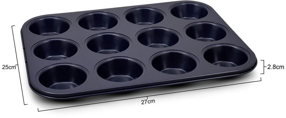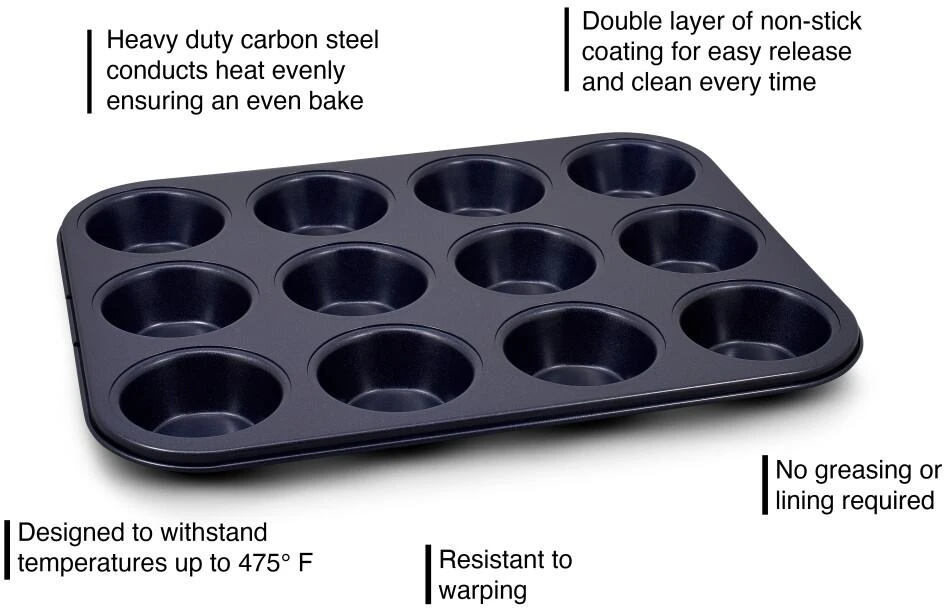 Mit den gleichmäßig verteilten tiefen Formen für perfekt aufgegangene Backwaren ist diese Backform ideal für Cupcakes sowie süsse und herzhafte Muffins. Hergestellt aus robustem, formstabilen Karbonstahl ist es leicht zu reinigen. Einfach in warmem Seifenwasser von Hand waschen, abspülen und gründlich trocknen oder in den Geschirrspüler geben. Wie bei allen Metallwaren mit Antihaftbeschichtung sollten niemals Topfkratzer oder aggressive Scheuermittel verwendet werden.